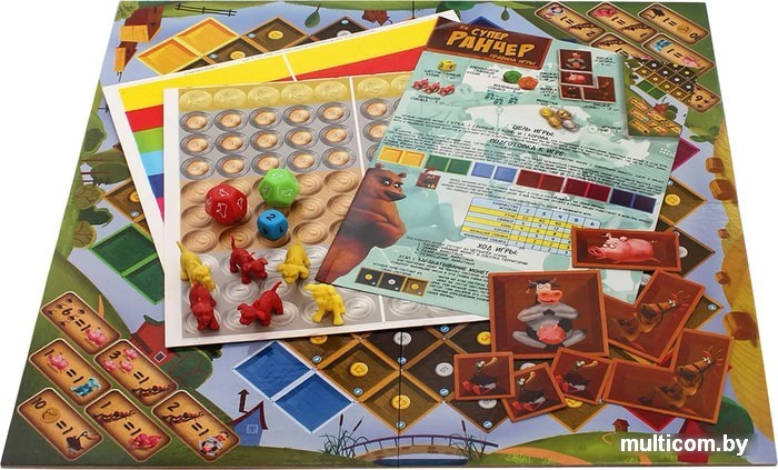 | Комплектация | игровое поле, 4 вида фишек животных: утка, свинья, лошадь, корова, пластмассовые фигурки собак - маленьких 3 шт, больших 3 шт, два 12-гранных кубика и один 6-гранный кубик, монеты. |