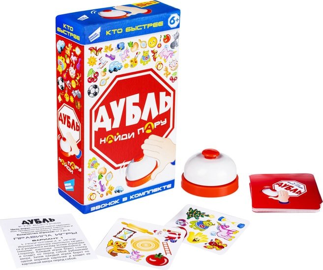 | Информация | Невероятно весёлая игра на внимательность и реакцию. Цель игры: найти одинаковые предметы на разных карточках и первым ударить в звонок! Победителем становится тот, кто окажется самым быстрым и внимательным и сможет собрать у себя больше всего карточек. Правила предложат вам 5 режимов игры. |