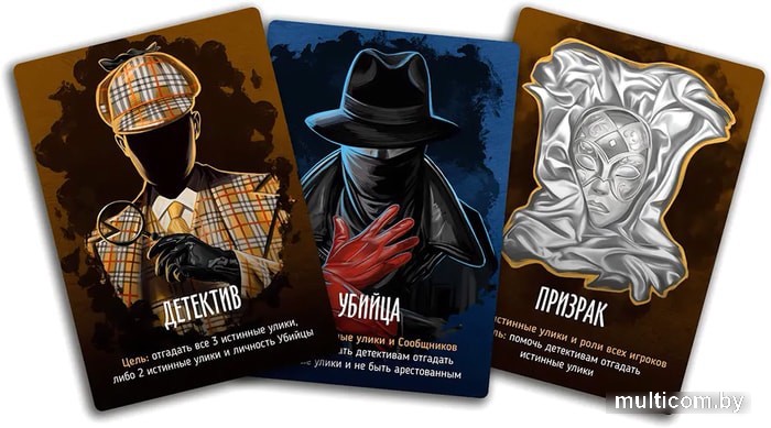 | Комплектация | - 150 карт улик- 14 карт тайных ролей- 12 карт персонажей (двусторонние)- 3 жетона категорий- 1 жетон рации- 1 жетон почтового ящика- карта-памятка- правила игры |