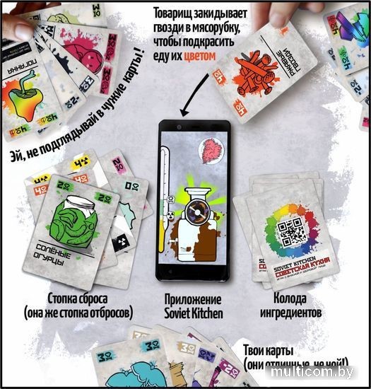 | Информация | Советский Союз. Какие это были времена... Пустые полки в магазинах, но какой простор для самореализации! Поздравляем, вы – свежеиспечённые выпускники кулинарного техникума, которых не пугают трудности. Ведь вы знаете один важный секрет: любой ингредиент (даже не особо съедобный, на первый взгляд) можно пропустить через мясорубку! Колбаса недостаточно красная? Добавим в неё ржавых гвоздей! Кажется, что это пюре уже кто-то съел раньше? Подкрасим его жёлтым песочком! Звучит ужасно, да? Но вам же нужно прокормить Родину-матушку! Однако будьте осторожны: не стоит допускать, чтобы ваши гости слишком часто умирали, пока вы строите карьеру от кашевара в военной казарме до шеф-повара первого лица государства! Карточная игра с приложением для iOS / Android, где вы сканируете карты ингредиентов, забросывая их в мясорубку на экране вашего смартфона! Ваша задача – получать из самых странных ингредиентов блюдо подходящего цвета. Вас ждёт Режим Кампании из 22 миссий, а также несколько вариантов игры в Режиме Испытаний, включая колодостроительный вариант игры (для опытных игроков). Правила можно не читать: приложение само всё подскажет прямо по ходу игры! |