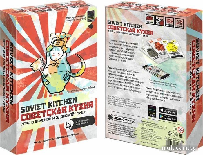 | Комплектация | - 112 карт (63х89 мм) - органайзер от Meeple House - буклет правил - приложение Soviet Kitchen |