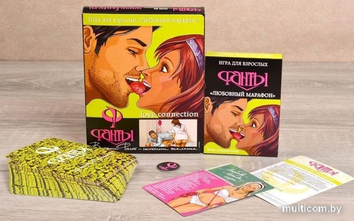 | Комплектация | 48 фантов четырех цветов: белые, желтые, розовые и красные;Фишка, чтобы определять, кто следующим тянет задание;Правила игры с рекомендациями, как получить от «Любовного марафона» максимум удовольствия. |