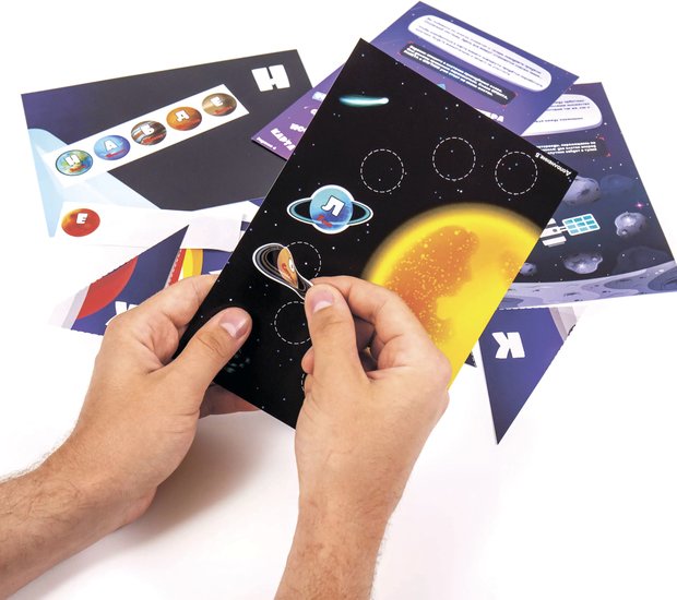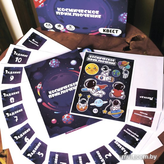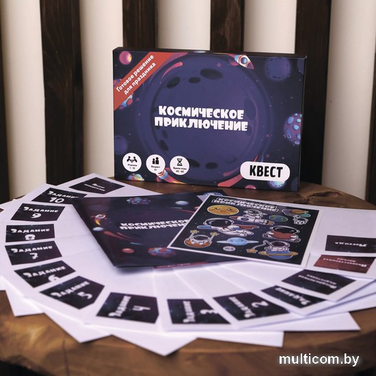 | Комплектация | Карточка с легендой игры Приветственное письмо с загадкой Навигационный журнал с маршрутом и информацией о звездах вселенной Карточка предполётной подготовки (интерактивная игра перед квестом) 10 конвертов с яркими иллюстрациями и загадками 6 дополнений с головоломками и ребусами Подробная инструкция для организации игры Стикерпак Письмо победителям |