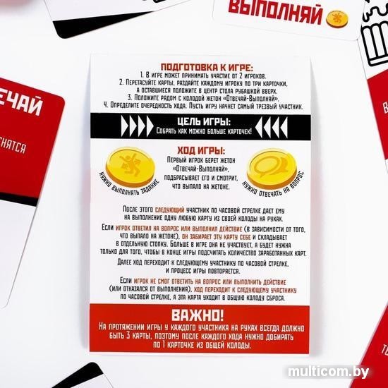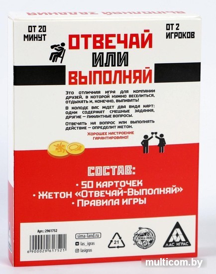 | Комплектация | 50 карточек; жетон «Отвечай/выполняй»; правила игры. |