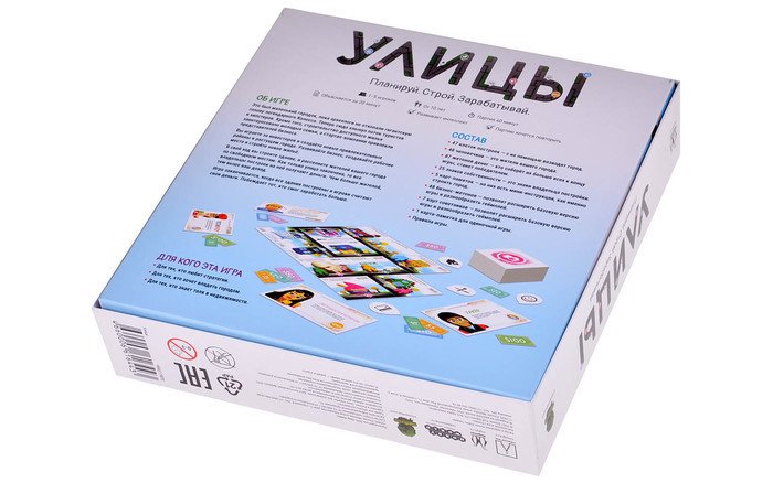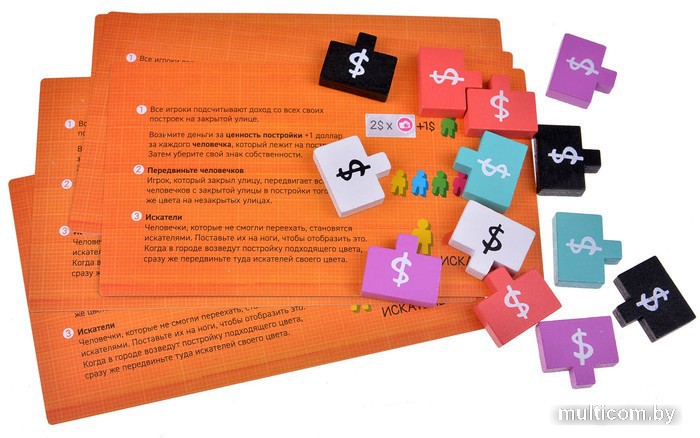 | Комплектация | — 47 клеток построек — с их помощью возводят город. — 48 человечков — это жители вашего города. — 87 жетонов денег — кто соберёт их больше всех к концу игры, станет победителем. — 25 знаков собственности — это знаки владельца постройки. — 5 карт-памяток — на них есть мини-инструкция, как именно строить город. — 48 бизнес-жетонов — позволят расширить базовую версию игры и разнообразить геймплей. — 7 карт советников — позволят расширить базовую версию игры и разнообразить геймплей. — 1 карта-памятка для одиночной игры. — Правила игры. |