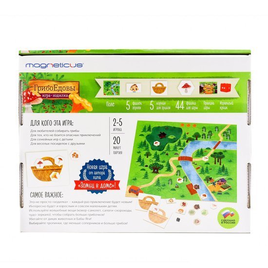 | Комплектация | Игровое поле, 44 фишки для игры, игральный кубик, 5 корзин, 5 фишек героев игры, картонная коробка |
