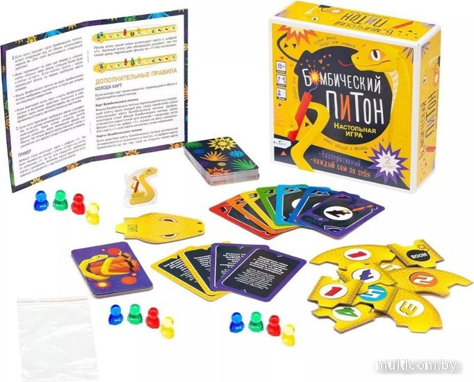 | Комплектация | - правила; - фишки 12 шт.; - карты 56 шт.; - фишка Бомбического питона; - 55 элементов игрового поля. |
