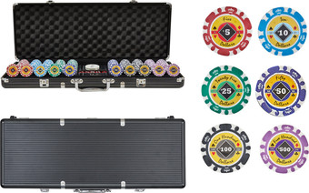 | Информация | *Диаметр фишек номиналом 500 и 1000 - 43мм Что в наборе:500 фишек 2 колоды карт 5 костей Фишка дилера Ключи от кейса |