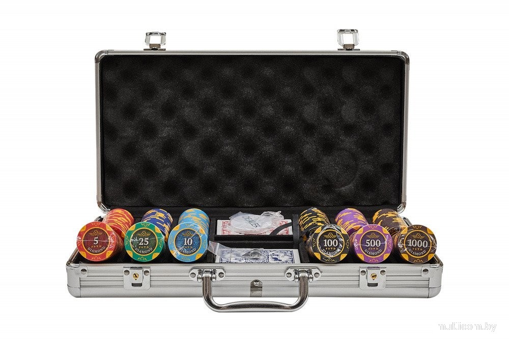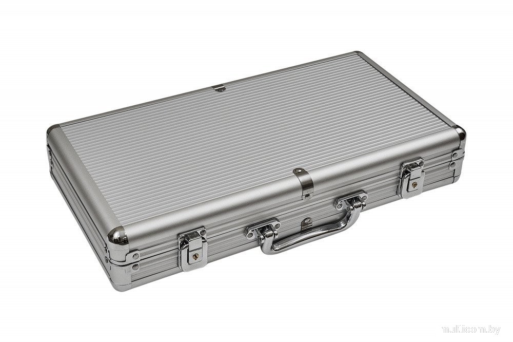 | Комплектация | 300 фишек, 2 колоды карт, 5 кубиков, фишка дилера, металлический кейс |