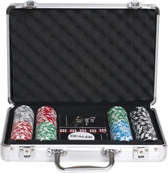 | Комплектация | набор включает 200 фишек разных номиналов, игральные кости, 2 колоды пластиковых карт, фишку дилера, стальной кейс с ключами |