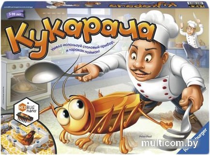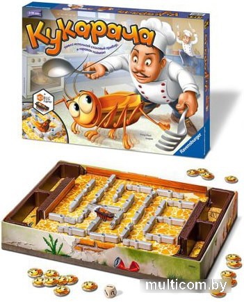 | Комплектация | подставка, игровое поле, таракан, 18 фишек, 24 защёлки, игровой кубик, 4 ловушки, 2 двери, по 8 вилок, ложек и ножей, батарейка. |