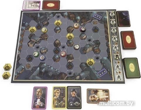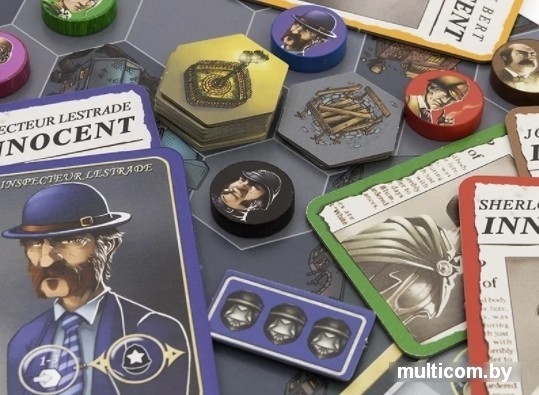 | Комплектация | 1 маркер текущего хода; 2 жетона закрытых люков; 8 картонных карточек персонажей; 1 карточка Джека; 6 гексагональных жетонов фонарей; правила; 2 жетона полицейских кордонов; 8 картонных карточек алиби |