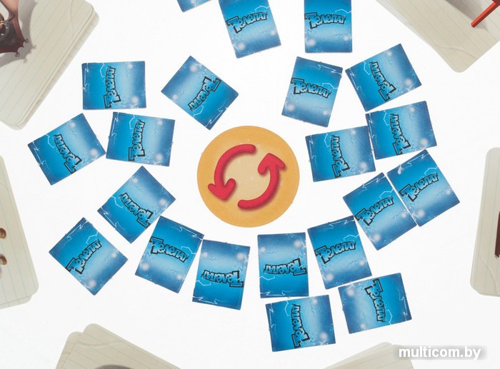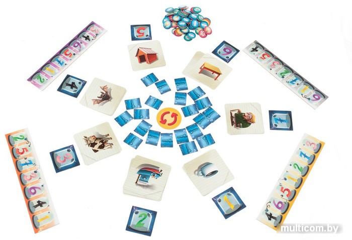 | Комплектация | 65 двухсторонних карточек с изображениями предметов, 7 квадратных жетонов, 21 прямоугольный жетон, 1 круглый жетон, 7 планшетов для голосования, жетоны победных очков, правила игры на русском языке. |