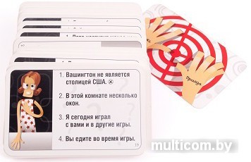 | Комплектация | 89 карт (по 4 утверждения на каждой, всего 356 утверждений), 1 карта Ответа, правила игры на русском языке, коробка. |