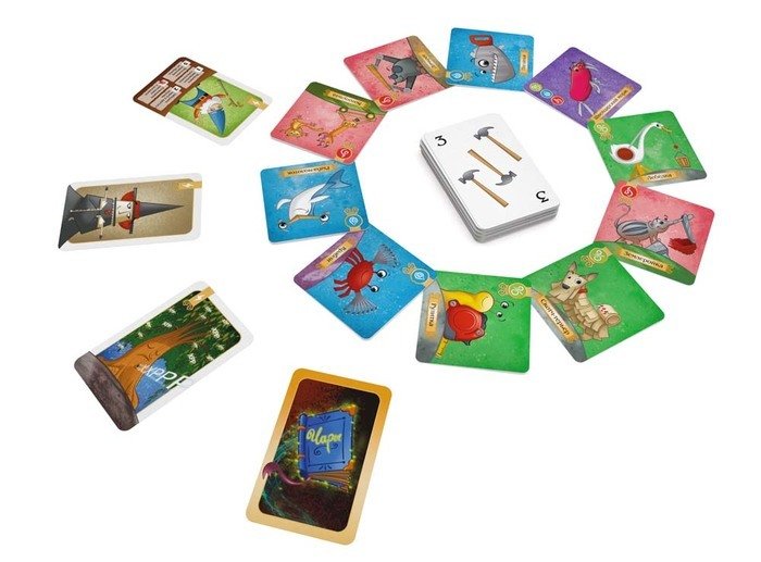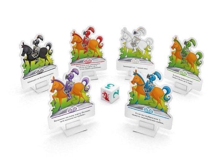 | Комплектация | 40 числовых карт (по четыре экземпляра от 1 до 10); 12 королев; 10 королей; 10 волшебных помощников; 6 рыцарей и подставок для них; 6 Диких гномов; 5 Ведьм-менял; 5 Сонных ив; 4 Книги чар; 2 памятки хода; 1 кубик; правила игры |