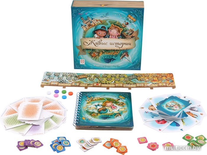 | Комплектация | - волшебная книга (основа для ваших сказок); - 10 историй (в том числе истории, сюжет которых выбирают сами игроки); - 86 героев- животных; счётчик очков; - 6 наборов игроков (фишка и 6 жетонов в каждом); - правила игры. |