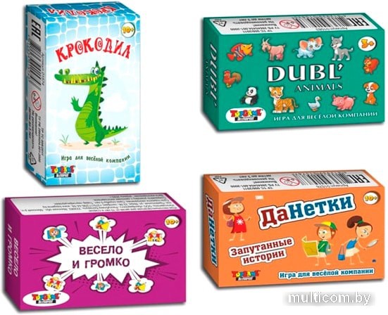 | Информация | Набор состоит из четырех популярных карточных игр: "Крокодил", "Дубль.Животные", "Весело и громко", "ДаНетки". |