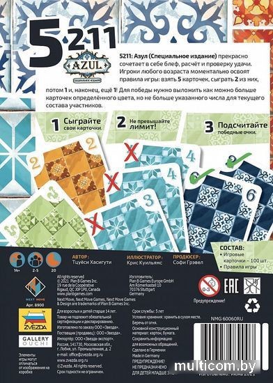 | Информация | Каждый любитель серии «Азул» порадуется, что теперь появилась возможность взять с собой игру на любимую тему и сыграть в неё в любой момент. Освоить правила можно за пять минут — ведь основной принцип описан в названии. Игроки получают по пять карточек, в первый ход все играют по две, а потом еще дважды по одной. Для победы надо выложить как можно больше карточек одного цвета, но не превысить указанное число для текущего состава участников. Размер карточек 7?10 см — приятно лежат в руках! Комплектация: Правила игры. Игровые карточки 100 шт. |