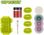 | Комплектация | - Полировальная паста - 1 шт. - Абразивный диск - 4 шт. - Полировальный диск - 1 шт. - Абразивные щетки - 3 шт. - Хвостовик 1/8" - 1 шт. - Кейс |