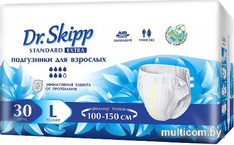 | Информация | Подгузники для взрослых Dr.Skipp Standard Extra предназначены для людей со средней степенью недержания мочи, обеспечивая людям чувство комфорта и реальную защиту от протекания. Оригинальный анатомический крой подгузника вместе с надёжными широкими многоразовыми застёжками, крепящимися в любое место поверхности подгузника и эластичного пояса обеспечивают надёжное прилегание изделия к телу и, как следствие, эффективную защиту от протекания жидкости наружу. Наружный и внутренние слои подгузника изготовлены из приятных на ощупь нетканых гипоаллергенных материалов, гарантированно не вызывающих у пользователя раздражений. Внутренний впитывающий слой – из распушенной целлюлозы с добавлением суперабсорбента- полимера (SAP), который моментально впитывает влагу, превращая её в гель и надёжно удерживающего запах. Конструкция подгузников дополнительно включает в себя нейтрализатор запаха, 3D объёмные бортики защиты от протекания и эластичные манжеты, предназначенные для защиты ног от натирания. Используемые при производстве данной линейки дышащие влагонепроницаемые материалы через микропоры позволяют испарениям выходить наружу, в результате чего кожа под подгузником остаётся сухой и не преет. Все используемые в производстве материалы гипоаллергенны, не имеют в составе парфюмерных и химических отдушек, не имеют запаха и не вызывают раздражения. |