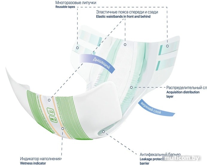 | Информация | Паропроницаемый внешний и воздухопроницаемый внутренний слои способствуют испарению влаги с поверхности кожи, что снижает риск возникновения опрелостей.Эластичные пояса спереди и сзади создают плотное прилегание, защиту от протекания и надёжную фиксацию подгузника.Антифекальный барьер защищает от протекания по бокам.Липучки с микрокрючками обеспечивают многоразовое и удобное застёгивание подгузника. |