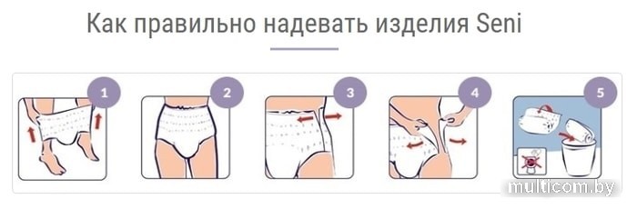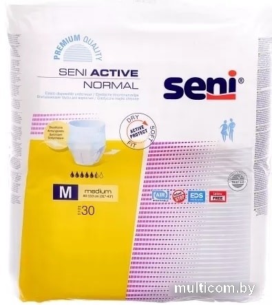 | Информация | Впитывающие трусы Seni Active Normal одноразового использования – это оптимальное решение для людей, ведущих активный образ жизни, а также для участников занятий по двигательной реабилитации.-надеваются и снимаются как обычное нижнее белье – незаметность в использовании и удобство в применении-анатомическая форма и эластичная манжета вокруг бедер – оптимальное прилегание к телу-боковые швы – удобная и быстрая смена трусов, нужно только разорвать боковые швы-гидрофобные внутренние боковые бортики – дополнительная защита от протеканий-двойной впитывающий слой с антибактериальным суперабсорбентом – высокая впитываемость и нейтрализация неприятного запаха-индикатор влагонасыщения – информация о степени наполнения и необходимости смены изделия-надпись «FRONT» – обозначение передней части трусов |
