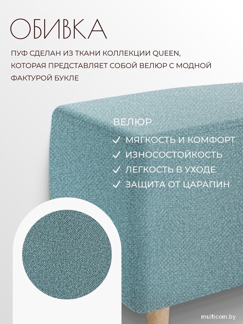 | Информация | - Пуф Тайвас (Queen Teal) — это идеальное компактное и стильное решение для вашего дома. Он отлично подходит в качестве опоры для ног, а настил из пенополиуретана обеспечивает мягкость и комфорт. Прочный мебельный щит в основании гарантирует надежность конструкции. - Обивка из велюра с текстурой букле добавляет уют и эстетическую выразительность в интерьер. Лаконичный дизайн без рисунка делает пуф универсальным, подходящим для любого стиля оформления. Каркас из светлого дерева подчеркивает естественность и прочность изделия. - Компактные размеры пуфа позволяют легко разместить его даже в малогабаритных помещениях. Он станет отличным дополнением для гостиной, спальни или прихожей, выполняя как декоративную, так и практическую функции. Использованные материалы обеспечивают долговечность и комфорт. - Пуф из коллекции Тайвас станет ярким акцентом в вашем интерьере, подчеркивая стиль и гармонию пространства. Легкий вес позволяет без труда перемещать его по дому, что особенно удобно в повседневной эксплуатации. - Пуф с велюровой обивкой не только радует глаз своей текстурой, но и обладает практичными характеристиками, обеспечивая комфорт и мягкость. Компактная конструкция позволяет легко разместить его в любом уголке вашего дома. |