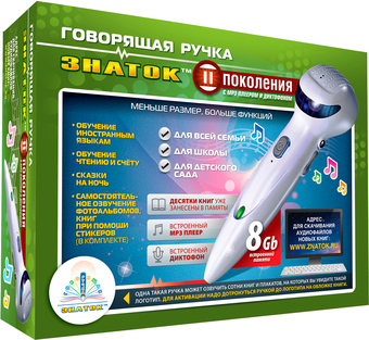 | Информация | Очень простая в использовании уникальная помощница, предназначенная для эффективного обучения иностранным языкам, как детей, так и взрослых. Она так же поможет обучить детей чтению и счёту, расскажет сказку на ночь, познакомит ребёнка с окружающим миром. Причём, ручка озвучивает не только слова, но и рисунки! В память ручки (4 GB) уже внесены книги, указанные на обратной стороне коробки и в инструкции. |