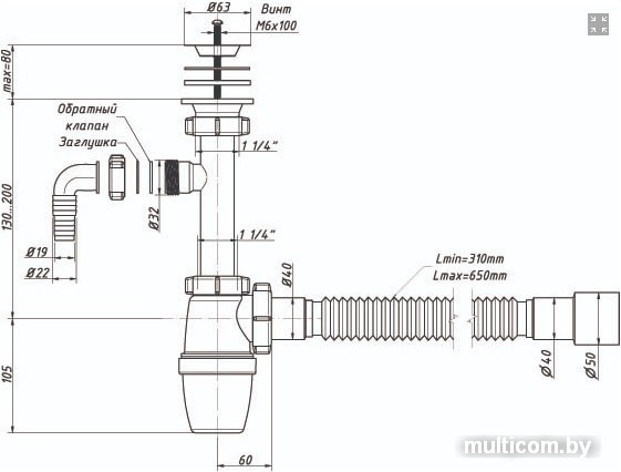 | Информация | Сифон с малым корпусом и отстойником для тюльпана и умывальника, выпуском с нержавеющей чашкой D63 мм и отводом для слива от стиральной машины. В комплекте удлинённый патрубок – удобен в установке сифона в ножку тюльпана, винт 100 мм для утолщённых моек и отвод в канализацию гибкая труба 40-40/50. |