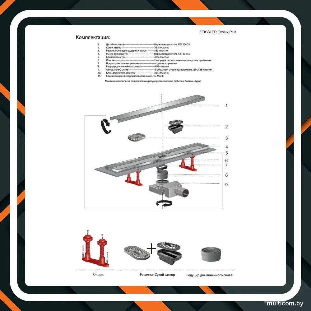 | Информация | - Трап для душа Tim Zst.1121.4002 выполнен в одном корпусе с гидрозатвором, что обеспечивает герметичность изделия и надежный барьер против запахов из системы канализации. - Прямоугольную форму решетки сантехнического устройства можно удачно обыграть при установке устройства вдоль стен, рядом с перегородкой и т.д. - Дренажное устройство имеет минимальную высоту, что обеспечивает простоту установки путем встраивания в пол ванной. - Конструкция имеет горизонтальный выпуск для прямого вывода стоков в канализацию. - Высокая пропускная способность делает лоток одним из лучших вариантов при эксплуатации как в частных домовладениях, так и помещениях коммерческого назначения — банях, душевых спортзалов и т.д. - Душевой лоток изготавливался с учетом воздействия бытовой химии, высокой влажности и температуры, поэтому его сливные элементы выполнены из нержавеющей стали. |