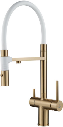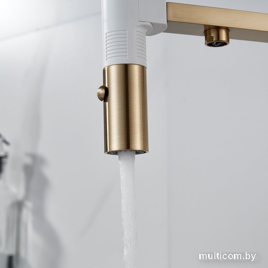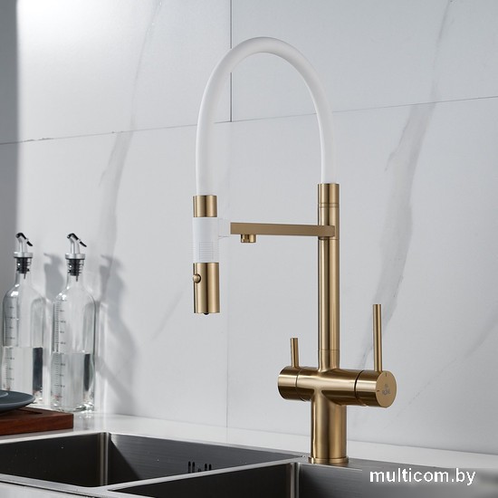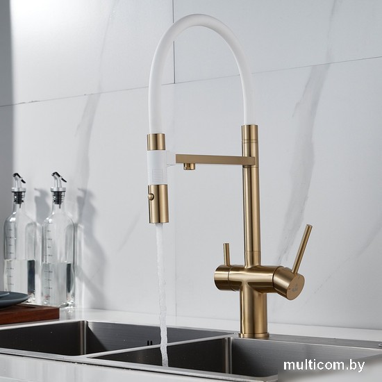 | Информация | ? Смеситель Rose R958E для кухни с гибким изливом и магнитной вставкой под фильтр выполнен в золотом цвете. |