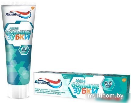 | Информация | Зубная паста Aquafresh Мои большие зубки - это мягкая пенящаяся зубная паста, специально разработанная для детей в возрасте от 6 до 8 лет. В ее состав входит технология Активная защита от сахара, основанная на фторе, которая помогает укреплять эмаль и защищает от кариеса не только молочные, но и новые постоянные зубы. |