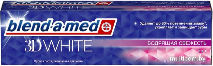 | Информация | Доверьте заботу о белизне своей улыбки зубной пасте Blend-a-med 3D White «Бодрящая свежесть». Это комплексное решение 3 в 1 - зубная паста, которая отбеливает, укрепляет и защищает зубы. Её особая формула мягко удаляет поверхностное потемнение с эмали, не повреждая её структуру, и дарит сияющую улыбку, а бодрящий мятный аромат оставляет ощущение свежести. Удаляет до 80% поверхностного потемнения эмали 3 в 1: отбеливает, укрепляет, защищает от зубного налёта Формула безопасна для эмали |