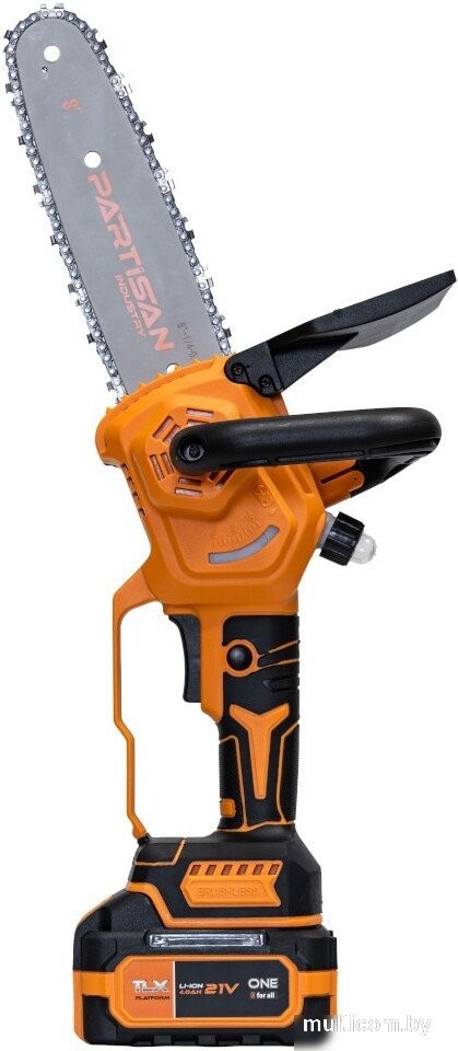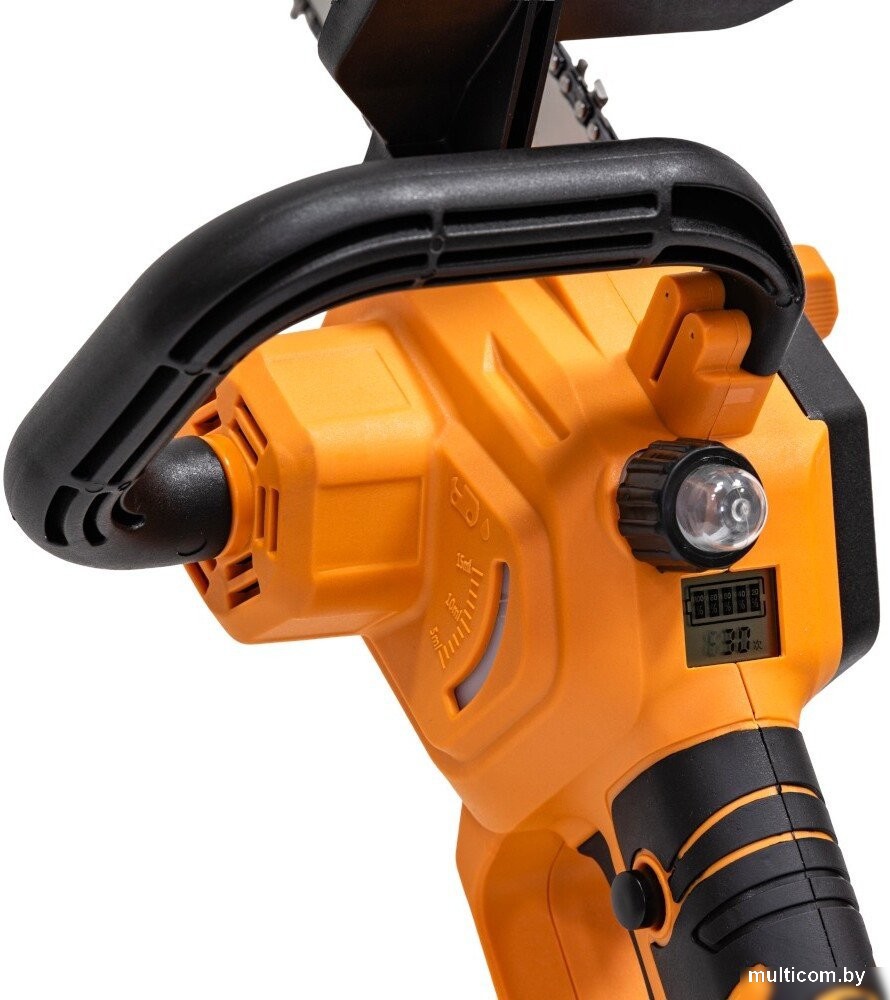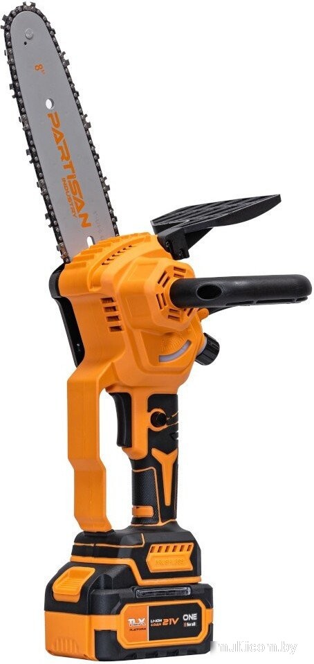 | Информация | • Бесщеточный двигатель поддерживает стабильные обороты под нагрузкой, обеспечивая высокую скорость реза даже на сырой древесине. • 8-дюймовая шина увеличивает глубину пропила до 200 мм, позволяя обрабатывать ветки толщиной до 120 мм за один проход. • Система смазки цепи подает масло, снижая трение и предотвращая заклинивание в плотных материалах. • Натяжение цепи без ключа регулируется отверткой через боковой люк, сокращая время подготовки к работе до 1 минуты. • Эргономичная рукоятка с резиновыми вставками гасит вибрацию, позволяя работать без усталости. • Индикатор заряда АКБ на корпусе предупреждает о необходимости подзарядки до полной остановки пилы. • Двойная блокировка пуска требует одновременного нажатия кнопки безопасности и включателя, исключая случайное включение при падении или неосторожном обращении. • Автостоп цепи срабатывает при отпускании курка предотвращая контакт с движущимися элементами во время паузы. • Режим термозащиты отключает двигатель при перегреве, сохраняя срок службы электроники и снижая риск возгорания. • Рабочий упор фиксирует положение пилы относительно ветки, минимизируя отдачу при контакте с твердыми сучками. |