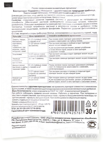 | Информация | Кормилица Микориза обеспечит ваши растения верными друзьями на всю жизнь. Он содержит дружественные растениям грибы, которые формируют с корнями взаимовыгодный симбиоз. Благодаря этому всасывающая способность корневой системы возрастает на порядок, и растения значительно легче получают воду и питательные вещества. Кроме того, полезные грибы своим присутствием не дают развиваться болезнетворным микробам – это настоящий щит от болезней и стрессов. Состав препарата Мицелий и споры гриба рода Glomus, колонизированные фрагменты корней, торф. |