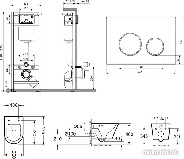 подвесной, конструкция: без бачка, задний подвод воды, горизонтальный выпуск, двухрежимный слив, с сиденьем