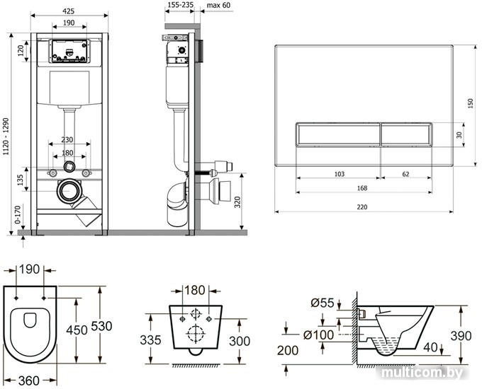 подвесной, без бачка, задний подвод воды, горизонтальный выпуск, двухрежимный слив, с сиденьем