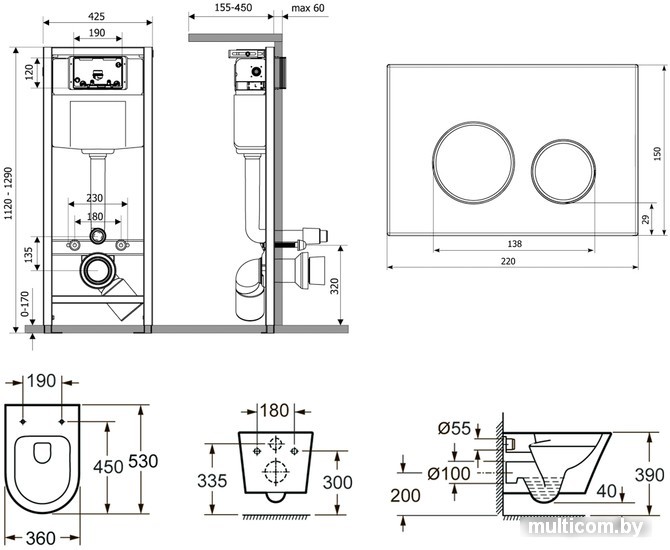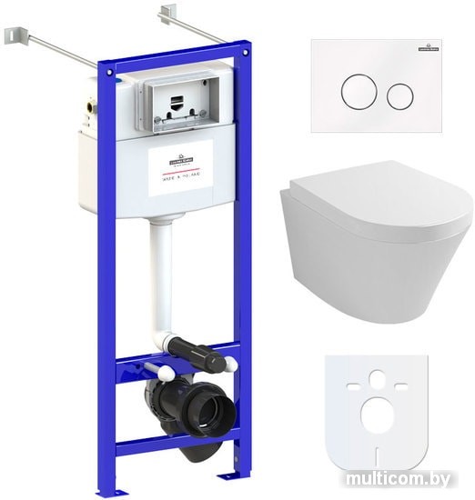 подвесной, без бачка, задний подвод воды, горизонтальный выпуск, двухрежимный слив, с сиденьем