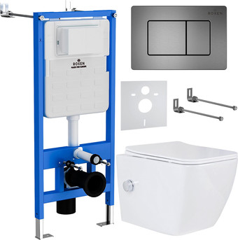 | Информация | Комплект инсталляции 6 в 1 Roxen StounFix Slim 624013 с удлиненными креплениями в комплекте, шумоизоляционной плитой, металлической кнопкой смыва Roxen Steel 420260G ?и подвесным унитазом Roxen Antares 530185-01 Rimless Soft Close. Система инсталляции для унитаза Roxen StounFix Slim 710200 - надежная усиленная ультратонкая модель для максимальной экономии свободного пространства. Оптимальная выверенная монтажная глубина 120 мм позволяет создать необходимое давление в смывном бачке для максимально мощного смывного потока воды! Инсталляция Roxen StounFix Slim выполнена из высокопрочной стали и покрыта специальной порошковой краской, методом автоматического вакуумного напыления. Бачок защищен дополнительной шумоизоляционной пластиной S-Protect, которая предотвращает образование конденсата и плесени. Механическое управление смыва обеспечивает бесперебойную работу на весь срок службы. Инсталляция комплектуется удлиненными креплениями Plattenbau (при помощи удлиненных шпилек 50 см), что позволит вам без проблем отрегулировать необходимую монтажную глубину. Особенности инсталляции: усиленная монтажная рама выдерживает до 400 кг нагрузки, при испытуемой нагрузке 800 кг ультратонкий монтаж - монтажная глубина 120 мм подходит для всех типов унитазов (18 см, 23 см) удлиненные крепления механическое управление смыва цельнолитой бачок выполнен из высококачественного пластика HDPE шумоизоляционная пластина S-Protect, предотвращает образование конденсата и плесени объем бачка: 3/6 л расширенное ревизионное окно для быстрого и легкого доступа к сливной арматуре тихое наполнение бачка 2-х режимная система смыва шумоизоляционная плита латунный запорный вентиль гарантия производителя 25 лет Кнопка для инсталляции Roxen Steel 420260G - ультратонкая смывная клавиша Slim Button (толщина - 6 мм). Стильный минималистичный дизайн с удобными круглыми клавишами придаст вашему санузлу изящный внешний вид. Кнопка изготовлена из антивандальной нержавеющей стали марки AISI, имеет специальное антибактериальное покрытие Purity. Быстросъемная система Easy Fix обеспечивает быстрый доступ к коммуникациям (монтаж и демонтаж клавиши осуществляется без специального инструмента). Надежный механизм клавиши рассчитан на 200 000 циклов. Характеристики клавиши смыва: цвет: оружейная сталь ширина, мм: 246 высота, мм: 165 толщина, мм: 6 управление: механическое материал: брашированная нержавеющая сталь с ручной обработкой металла Hand Made поверхность: матовая ударопрочная нестираемое покрытие поверхности специальное антибактериальное покрытие Purity бесшумная двухрежимная система смыва LightTouch быстросъемная система Easy Fix для быстрого доступа к коммуникациям Подвесной унитаз Roxen Antares 530185-01 Rimless Soft Close - компактная модель с удобной безободковой чашей Pro-Rimless, благодаря чему нет труднодоступных зон для уборки. Изготовлен из санитарного фарфора Porcelain, который обеспечивает прочность изделия, белизну, абсолютно гладкую поверхность, отсутствие пор и углублений. Специальное антибактериальное покрытие Ultra Glide обеспечивает легкий уход, гигиеничность и первоначальный внешний вид на долгие годы. Модель укомплектована тонким быстросъемным сиденьем с крышкой Soft Close (плавное опускание). размер (ГхШхВ), см: 485х365х365 материал: санитарный фарфор антибактериальное покрытие безободковая чаша круговое омывание чаши дюропластовое быстросъемное сиденье Slim (тонкое) си