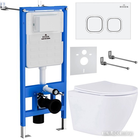 | Информация | Комплект инсталляции 6 в 1 Roxen StounFix Slim 533395 с удлиненными креплениями в комплекте, шумоизоляционной плитой, кнопкой смыва Roxen Santi 410280W ?и подвесным унитазом Roxen Antares 530185-01 Rimless Soft Close. Система инсталляции для унитаза Roxen StounFix Slim 710200 - надежная усиленная ультратонкая модель для максимальной экономии свободного пространства. Оптимальная выверенная монтажная глубина 120 мм позволяет создать необходимое давление в смывном бачке для максимально мощного смывного потока воды! Инсталляция Roxen StounFix Slim выполнена из высокопрочной стали и покрыта специальной порошковой краской, методом автоматического вакуумного напыления. Бачок защищен дополнительной шумоизоляционной пластиной S-Protect, которая предотвращает образование конденсата и плесени. Механическое управление смыва обеспечивает бесперебойную работу на весь срок службы. Инсталляция комплектуется удлиненными креплениями Plattenbau (при помощи удлиненных шпилек 50 см), что позволит вам без проблем отрегулировать необходимую монтажную глубину. Особенности инсталляции: усиленная монтажная рама выдерживает до 400 кг нагрузки, при испытуемой нагрузке 800 кг ультратонкий монтаж - монтажная глубина 120 мм подходит для всех типов унитазов (18 см, 23 см) удлиненные крепления механическое управление смыва цельнолитой бачок выполнен из высококачественного пластика HDPE шумоизоляционная пластина S-Protect, предотвращает образование конденсата и плесени объем бачка: 3/6 л расширенное ревизионное окно для быстрого и легкого доступа к сливной арматуре тихое наполнение бачка 2-х режимная система смыва шумоизоляционная плита латунный запорный вентиль гарантия производителя 25 лет Кнопка для инсталляции Roxen Santi 410280W - ультратонкая смывная клавиша Slim Button (толщина - 8 мм). Стильный минималистичный дизайн с удобными клавишами в хромированном обрамлении придаст вашему санузлу изящный внешний вид. Кнопка изготовлена из ударопрочного, экологически чистого ABS пластика марки HDPE, имеет нестираемое покрытие поверхности. Быстросъемная система Easy Fix обеспечивает быстрый доступ к коммуникациям (монтаж и демонтаж клавиши осуществляется без специального инструмента). Надежный механизм клавиши рассчитан на 200 000 циклов. Характеристики клавиши смыва: цвет: белый, с хромированной окантовкой ширина, мм: 246 высота, мм: 165 толщина, мм: 8 управление: механическое материал: пластик HDPE ударопрочная нестираемое покрытие поверхности специальное антибактериальное покрытие Purity бесшумная двухрежимная система смыва LightTouch быстросъемная система Easy Fix для быстрого доступа к коммуникациям Подвесной унитаз Roxen Antares 530185-01 Rimless Soft Close - компактная модель с удобной безободковой чашей Pro-Rimless, благодаря чему нет труднодоступных зон для уборки. Изготовлен из санитарного фарфора Porcelain, который обеспечивает прочность изделия, белизну, абсолютно гладкую поверхность, отсутствие пор и углублений. Специальное антибактериальное покрытие Ultra Glide обеспечивает легкий уход, гигиеничность и первоначальный внешний вид на долгие годы. Модель укомплектована тонким быстросъемным сиденьем с крышкой Soft Close (плавное опускание). размер (ГхШхВ), см: 485х365х365 материал: санитарный фарфор антибактериальное покрытие безободковая чаша круговое омывание чаши дюропластовое быстросъемное сиденье Slim (тонкое) система Soft Close (медленное опускание крышки) металличес
