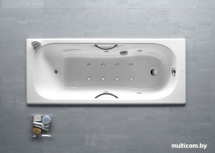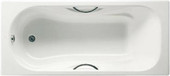 | Информация | Эмалированная ванна из чугуна со встроенным подголовником и подлокотниками, хромированными металлическими ручками и противоскользящим покрытием дна. |