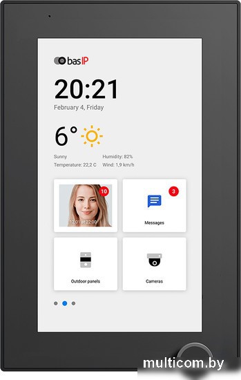 | Информация | 7 дюймовый IP видеодомофон с настенным горизонтальным и вертикальным монтажом, возможностью управления лифтом, выводом сообщений от управляющей компании, PoE, подключением 32 камер, памятью для фото/видео и автоответчиком. ОС — Android. |