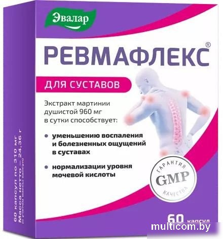 | Информация | Ревмафлекс – натуральный препарат для здоровья суставов, который не наносит вреда желудку. Способствует: улучшению подвижности и гибкости суставов и позвоночника (в т. ч. утренней скованности суставов); снижению риска разрушения хрящевой ткани, защите суставов от возрастных изменений, стимулированию восстановления хрящевой ткани, уменьшению воспаления в суставах, снятию отечности в суставов; уменьшению неприятных и болезненных ощущений в суставах и позвоночнике; снижению потребности в применении нестероидных противовоспалительных средств; нормализации уровня мочевой кислоты. Активное вещество: экстракт мартинии душистой.Рекомендации по применению: Взрослым - по 2 капсулы 2 раза в день во время еды. Форма выпуска: 60 капсул по 0,31 г. Состав: экстракт мартинии душистой, компоненты капсулы (пищевые добавки): желатин, оксид железа; целлюлоза микрокристаллическая (носитель), диоксид кремния аморфный и стеарат магния (агенты антислеживающие). Содержание в 4 капсулах (суточном приеме) и % от рекомендуемого уровня суточного потребления (адекватного уровня) Мартинии душистой экстракт, в том числе гарпагозид, не менее1 960 мг - 14 мг 70% 1В соответствии с ТУ 10.89.19-104-21428156-2020 Рекомендуется в качестве биологически активной добавки - источника гарпагозида. Экстракт мартинии обладает хондропротекторным действием и способствует: улучшению подвижности и гибкости суставов и позвоночника (в т. ч. утренней скованности суставов); снижению риска разрушения хрящевой ткани, защите суставов от возрастных изменений, стимулированию восстановления хрящевой ткани, уменьшению воспаления в суставах, снятию отечности в суставов; уменьшению неприятных и болезненных ощущений в суставах и позвоночнике; снижению потребности в применении нестероидных противовоспалительных средств; нормализации уровня мочевой кислоты. Рекомендации по применению: Взрослым - по 2 капсулы 2 раза в день во время еды. Продолжительность приема - не менее 1 месяца. При необходимости прием можно повторять. Противопоказания: Индивидуальная непереносимость компонентов. Беременность, кормление грудью. Перед применением рекомендуется проконсультироваться с врачом. |