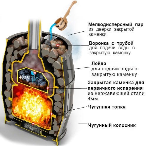 | Информация | Новая линейка дровяных печей для бани «Легенда Русский пар 24» рассчитанные на парное отделение объемом от 12 до 26 м3. «Легенда Русский пар 24» отличается от своей предшественницы дровяных печей для бани «Легенда Ураган» прежде всего наличием закрытой каменки, которая охваченная круговым потоком пламени, в которой камни прогреваются до температуры 600 °С, что позволяет создать в парилке наиболее благоприятный микроклимат, не пересушивая и не перегревая воздух.Вода подается в самую горячую центральную часть закрытой каменки через воронку (при этом дверь закрытой каменки должна быть приоткрыта для поступления мелкодисперсного пара в парное отделение) Все элементы топки отлиты из чугуна и соединены между собой с помощью болтового соединения через термостойкий шнур и герметик, а закрытая каменка изготовлена из жаростойкой высоколегированной 4 мм нержавеющей стали.На всех печах «Легенда Русский пар 24» установлены чугунные герметичные топочные двери с жаропрочным стеклом.Вес камней в закрытой каменке - 25 кг |