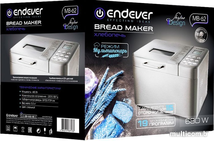 | Основные программы | безглютеновая выпечка, бездрожжевая выпечка, бородинский хлеб, варенье, десертная выпечка, йогурт, кекс, мультипекарь, пшеничный хлеб, сладкая выпечка, тушение, французский багет, цельнозерновой хлеб |