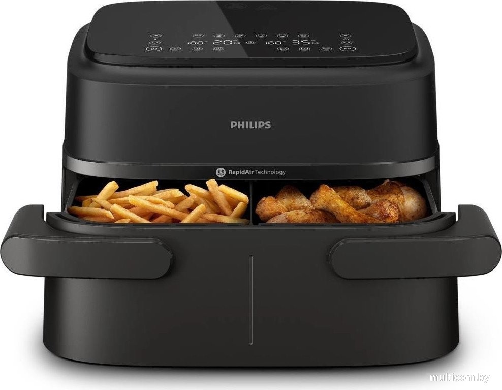 | Информация | -Компактный аэрогриль Philips серии 1000 с двумя корзинами - отличное решение для быстрой и здоровой готовки дома. Благодаря технологии RapidAir и уникальному дизайну камеры в форме звезды вы сможете приготовить блюда с хрустящей корочкой и нежной серединой, используя на 90% меньше жира по сравнению с обычной фритюрницей. -Модель оснащена съемным разделителем, что позволяет использовать две корзины по 3.55 л каждая или объединять их в один большой лоток объемом 7.1 л. Это дает возможность одновременно готовить два разных блюда или одну большую порцию, например, целую курицу или до 900 г картофеля фри. -Аэрогриль экономит до 40% пространства на кухне, оснащен эргономичными ручками для безопасной переноски и прост в уходе:съемные детали имеют антипригарное покрытие и подходят для мытья в посудомоечной машине. Устройство поддерживает 6 автоматических программ и 10 способов приготовления, а также функцию подогрева. -Управление осуществляется через цифровой интерфейс, есть функция автоматического отключения, поддержание температуры и возможность синхронизировать время готовки в обеих корзинах. В комплекте – инструкция, экологичная упаковка и доступ к персонализированным рецептам в приложении HomeID. |
