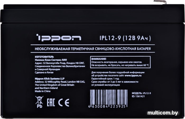 | Номинальная ёмкость | 9 А·ч |