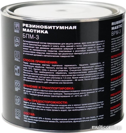 | Информация | ? Резинобитумная мастика БПМ-3 MasterWax MW010403 2.3кг - шумоизоляционный состав черного цвета на основе нефтяного битума, резиновой крошки, пластификаторов и специальных наполнителей, с содержанием ингибиторов коррозии. ? Антикоррозионная резинобитумная мастика БПМ-3 – тиксотропный состав, образующий эластичное покрытие, стойкое к механическому, химическому воздействию и различным температурным режимам. ? Обладает отличной адгезией к металлическим поверхностям и защищает от влаги, солевых растворов и коррозии. ?? Необходимо наносить на чистую, сухую, подготовленную поверхность. ? Подготовка поверхности: очистить от грязи и рыхлой ржавчины, удалить остатки ржавчины преобразователем, обезжирить универсальным обезжиривателем MasterWax (или ацетоном, уайт-спиритом) и просушить. ? Наносить при температуре окружающего воздуха 10-30°С. Перед применением перемешать и защитить поверхности, не подлежащие обработке. ? Наносить методом воздушного напыления или кистью в 1-2 слоя. Время межслойной сушки 5-6 часов при температуре 15-25°С, время высыхания готового покрытия – 48 часов. ?? При попадании на лакокрасочное покрытие автомобиля рекомендуется удалить уайт-спиритом или авиационным керосином. ? После окончания работ оборудование промыть уайт-спиритом или бензином. |
