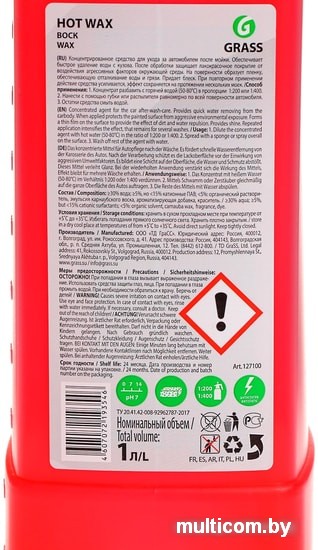 Информация | Концентрированное средство для ухода за а/м после мойки. Обеспечивает быстрое удаление воды с кузова. После обработки защищает ЛКП от воздействия агрессивных факторов окружающей среды. Придает блеск ЛКП, создает защитную пленку на поверхности. Очень экономное. При повторном применении действие средства усиливается, эффект сохраняется на протяжении нескольких моек.Состав:воск, катионные ПАВ, амиламин, минеральное масло, эмульгатор, гликоль, краситель, вода. Меры предосторожности: предохранять от мороза.Способ применения:1. Концентрат разбавить с горячей водой (50-80 С°) в пропорции до 1:400. 2. После мытья автомобиля губкой равномерно распределить горячий воск на кузов. 3. Остатки воска смыть водой. |