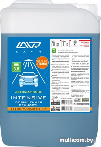 Информация | - Состав с повышенным пенообразованием для профессиональной бесконтактной мойки.- Обеспечивает легкое нанесение и экономичное использование.- Активные компоненты без следа удаляют грязь, масляные пятна, следы насекомых и другие виды загрязнений.- Легко смывается водой, не обладает выраженным запахом и не вызывает аллергических реакций.- Полностью безопасен для пластика, резины и сплавов цветных металлов.- Содержит ингибитор коррозии. |